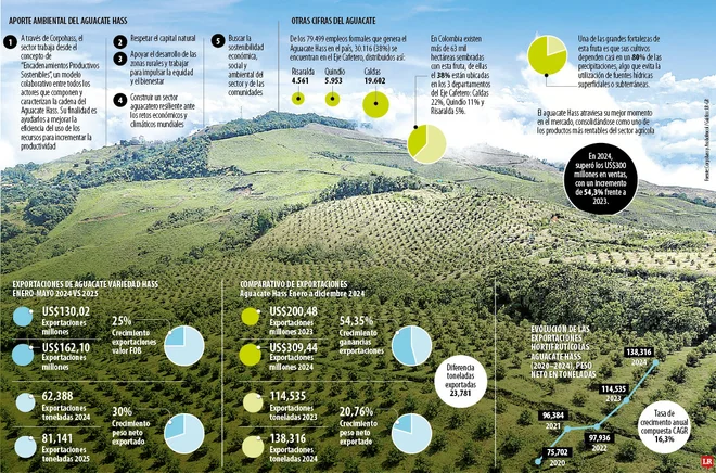 En 2024, las exportaciones nacionales de aguacate Hass alcanzaron 310 millones de dólares, equivalentes a más de 138.000 toneladas, con un crecimiento del 54% en valor y del 21% en volumen frente a 2023. Colombia es actualmente el segundo proveedor de aguacate Hass para Europa y el tercer exportador mundial, después de México y Perú.