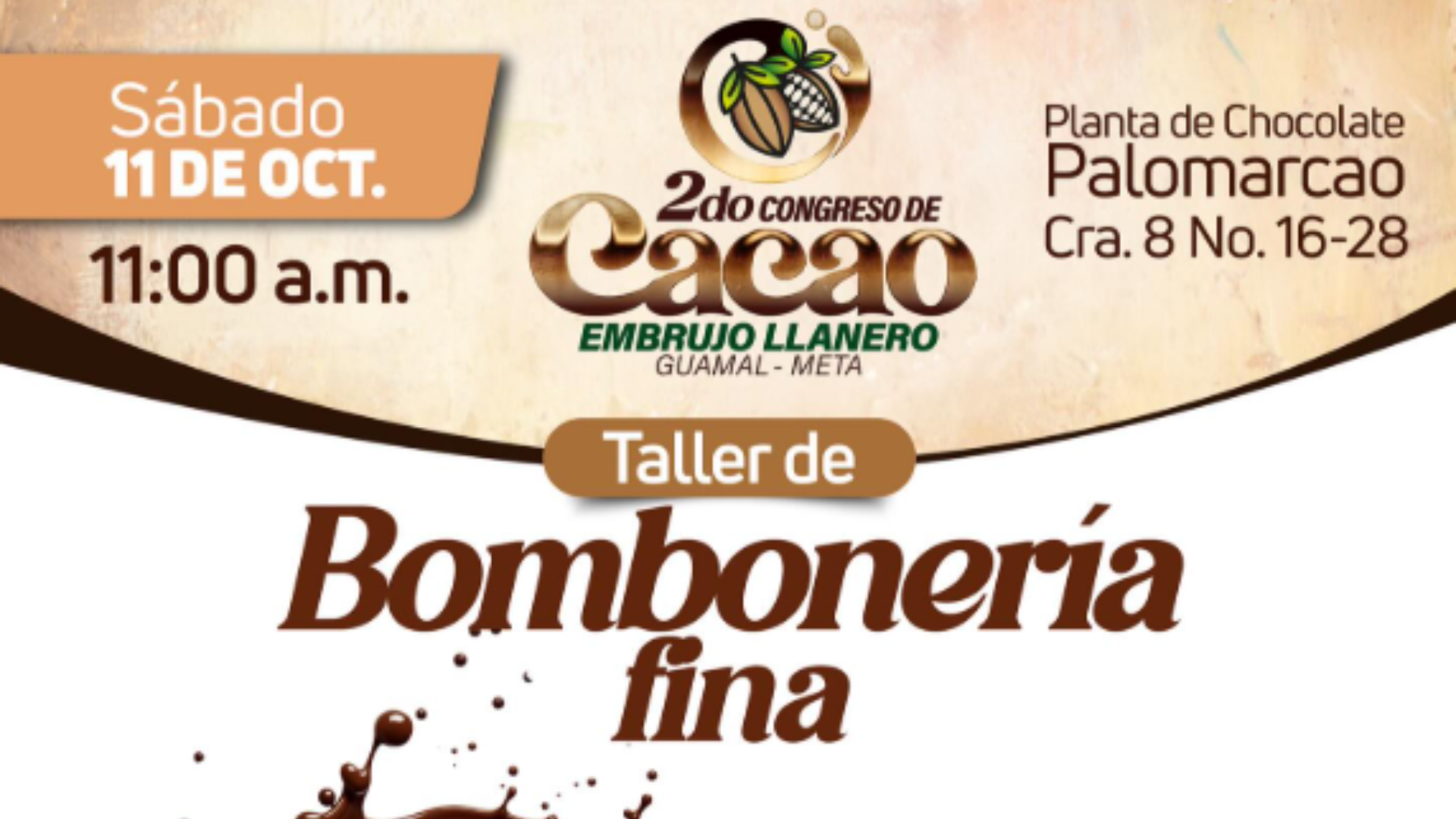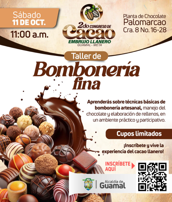 El taller se llevará a cabo el sábado 11 de octubre a las 11:00 a. m. en la Planta de Chocolate Palomarcao, ubicada en la Carrera 8 No. 16-28, en Guamal (Meta).